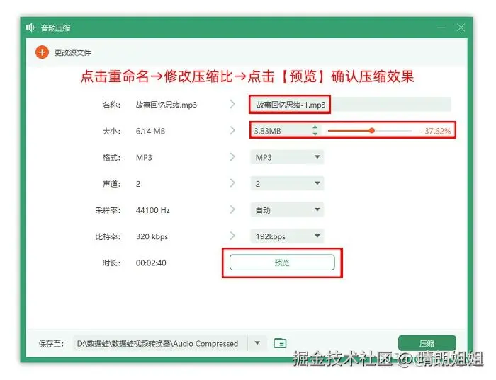 Step3:在音频压缩界面中,您可以点击调节音频压缩比的大小(压缩比的大小会导致mp3音频体积的相应变化),通过点击 【预览】 按钮可以调节出您最满意的压缩比数值。