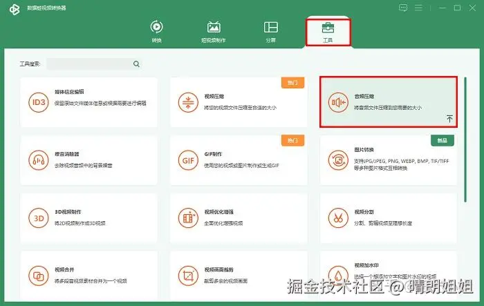 Step1:进入数据蛙视频转换器之后,默认为大家呈现的是 【转换】 页面。您可以点击切换到 【工具】 界面,然后点击 【音频压缩】 功能模块。