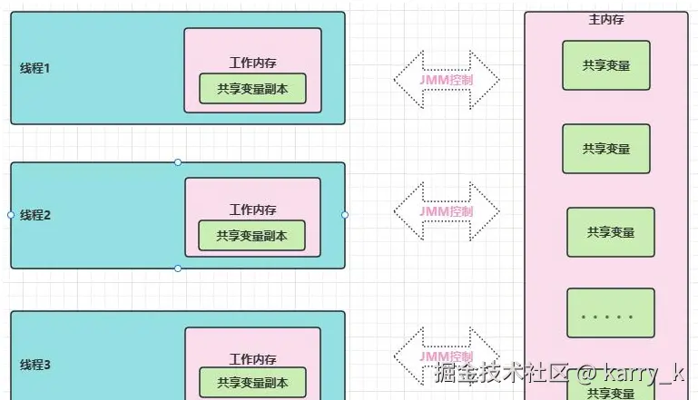 - 注意:这里的“主内存”与JVM内存区域中的“Java堆”或“方法区”在概念上有所关联但并不等同。可以理解为,堆和方法区中存储的共享数据,逻辑上都属于JMM的主内存范畴