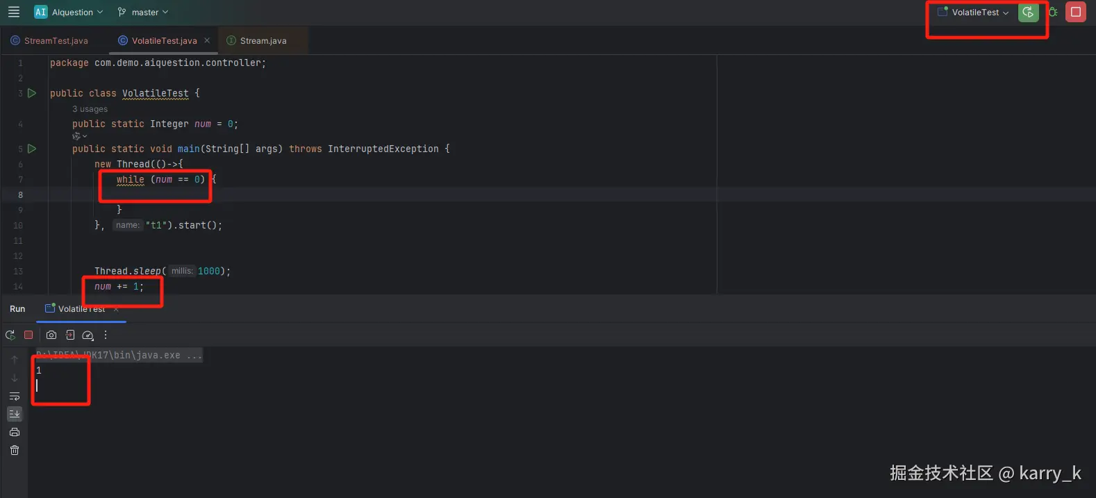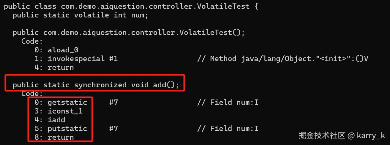 javap -c VolatileTest.class你会发现 里边的num++ 不是一行操作,所以会导致非原则性问题。