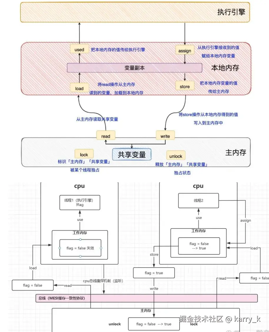 (8)write(写入) :作用于工作内存的变量,它把store操作从工作内存中的一个变量的值传送到主内存的变量中