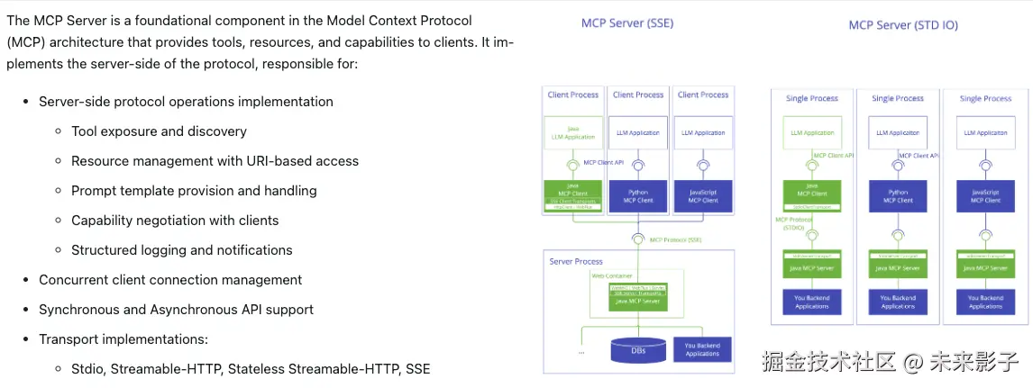 - 支持多种传输实现(STDIO、HTTP/SSE、可流式 HTTP 等)