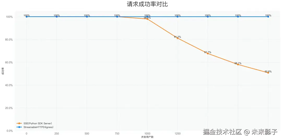 - **Streamable HTTP:**即使在高并发场景下仍能保持较高的请求成功率