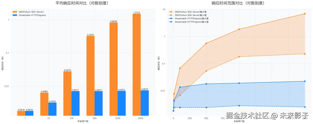- Streamable HTTP 的平均响应时间更短,响应时间波动较小,随并发用户数增加,响应时间增长更平