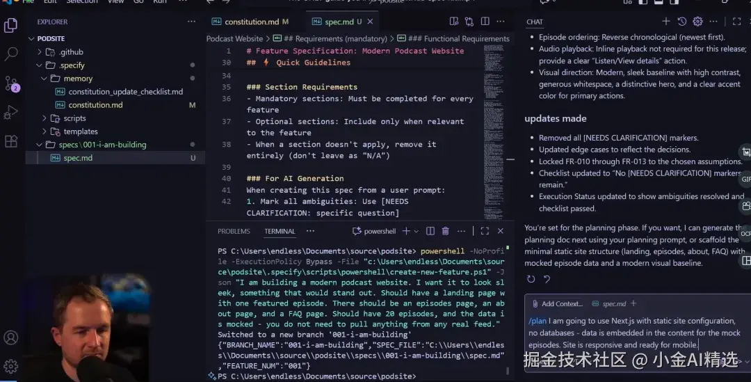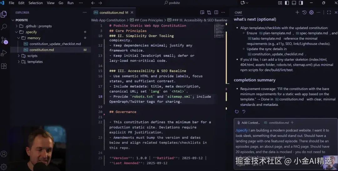 1. 定规则 :用 /constitution 命令设定项目的基本原则,比如代码质量要求、测试标准、性能指标等,相当于给项目定「规矩」。