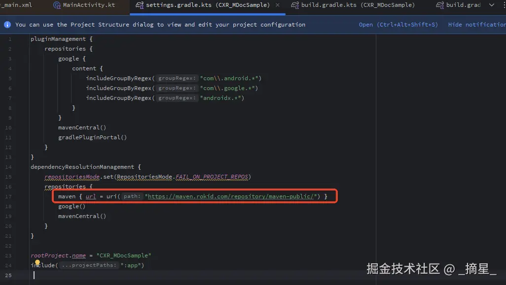 在 `settings.gradle.kts` 中添加 Rokid Maven 仓库:dependencyResolutionManagement {