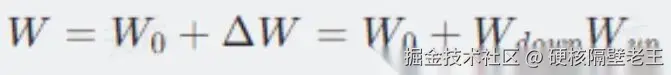 以LoRA为例,其通过将自注意力模块的权重变化分解为两个低秩矩阵的乘积实现参数压缩,即: