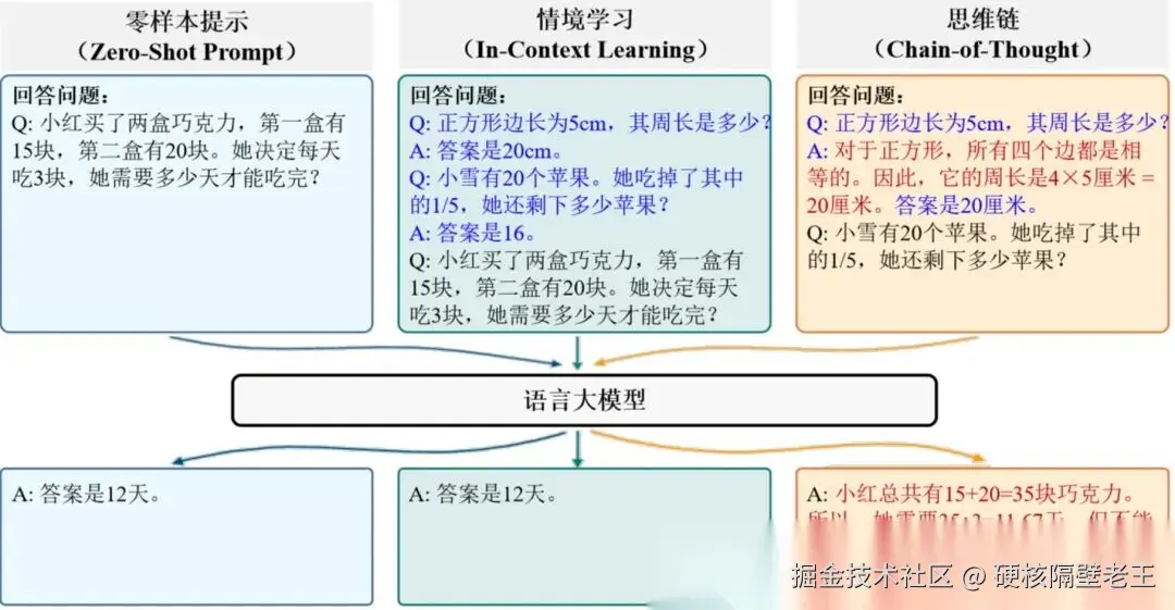 实现上,用含自然语言推理步骤的示例替代传统少样本提示的简单输入-输出对,构建“输入-思维链-输出”三元组框架。思维链能力是语言模型“涌现特性”,需模型参数规模足够大才显现。