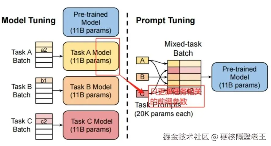 早期以 BERT 为代表的微调方法,是在大模型基座上增加一个任务适配层,然后进行全参微调,但是这种方法存在两方面的问题: