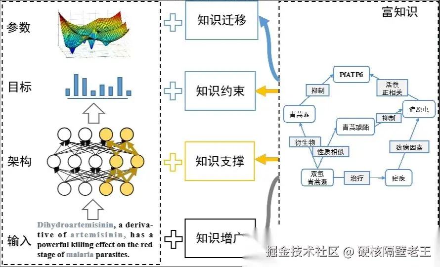 知识运用与推理能力是衡量语言大模型智能水平的重要因素。有效的解决方法是在深度学习模型基础上融入外部知识。根据大模型知识融合部位不同,从模型输入、神经架构、模型参数、输出等层面,知识融合方法大致分4类,如图所示: