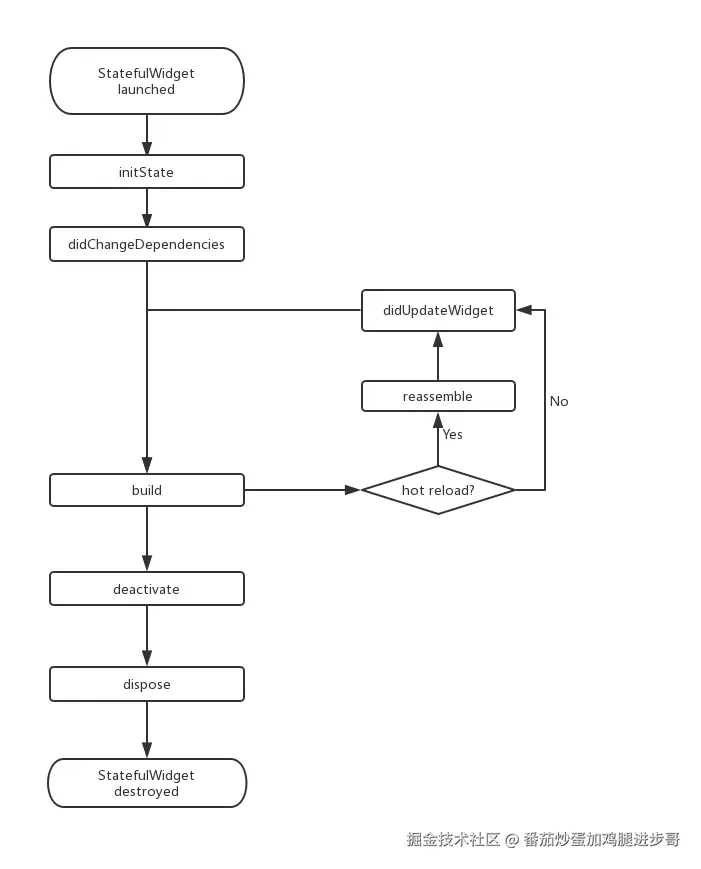 reassemble():此回调是专门为了开发调试而提供的,在热重载(hot reload)时会被调用,此回调在Release模式下永远不会被调用。didUpdateWidget ():在 widget 重新构建时,Flutter 框架会调用widget.canUpdate来检测 widget 树中同一位置的新旧节点,然后决定是否需要更新,如果widget.canUpdate返回true则会调用此回调。正如之前所述,widget.canUpdate会在新旧 widget 的key和runtimeType同时相等时会返回true,也就是说在在新旧 widget 的key和runtimeType同时相等时didUpdateWidget()就会被调用。deactivate():当 State 对象从树中被移除时,会调用此回调。在一些场景下,Flutter 框架会将 State 对象重新插到树中,如包含此 State 对象的子树在树的一个位置移动到另一个位置时(可以通过GlobalKey 来实现)。如果移除后没有重新插入到树中则紧接着会调用dispose()方法。dispose():当 State 对象从树中被永久移除时调用;通常在此回调中释放资源。