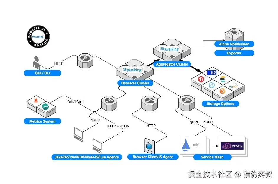 SkyWalking是Apache基金会下面的一个开源的应用程序性能监控系统,提供了一种简便的方式来清晰地观测云原生和基于容器的分布式系统。具有支持多种语言探针;微内核+插件的架构;存储、集群管理和使用插件集合都可以自由选择;支持告警;优秀的可视化效果的特点。其主要由4个核心组件构成,如下图所示: