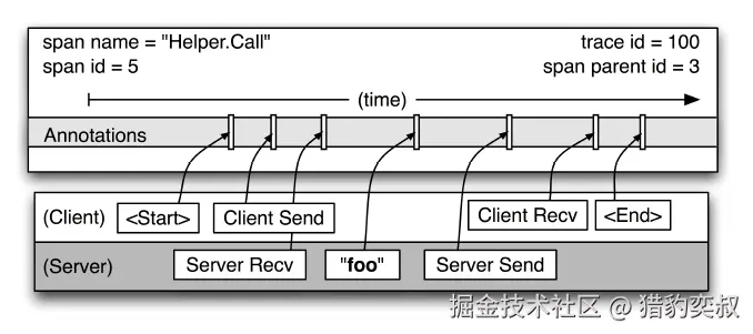 除了最基本的span name、span id和parent id之外,Annotations扮演着重要的角色,Annotations包括、Client Send、Server Recv、Server Send、Client Recv和这些注解,记录了RPC请求中Client发送请求到Server的处理响应时间戳信息,其中foo注解代表可以自定义的业务数据,这些也会一并记录到span中,提供给开发人员记录业务信息;在这当中有64位整数构成的trace id作为全局的唯一标识存储在span中。