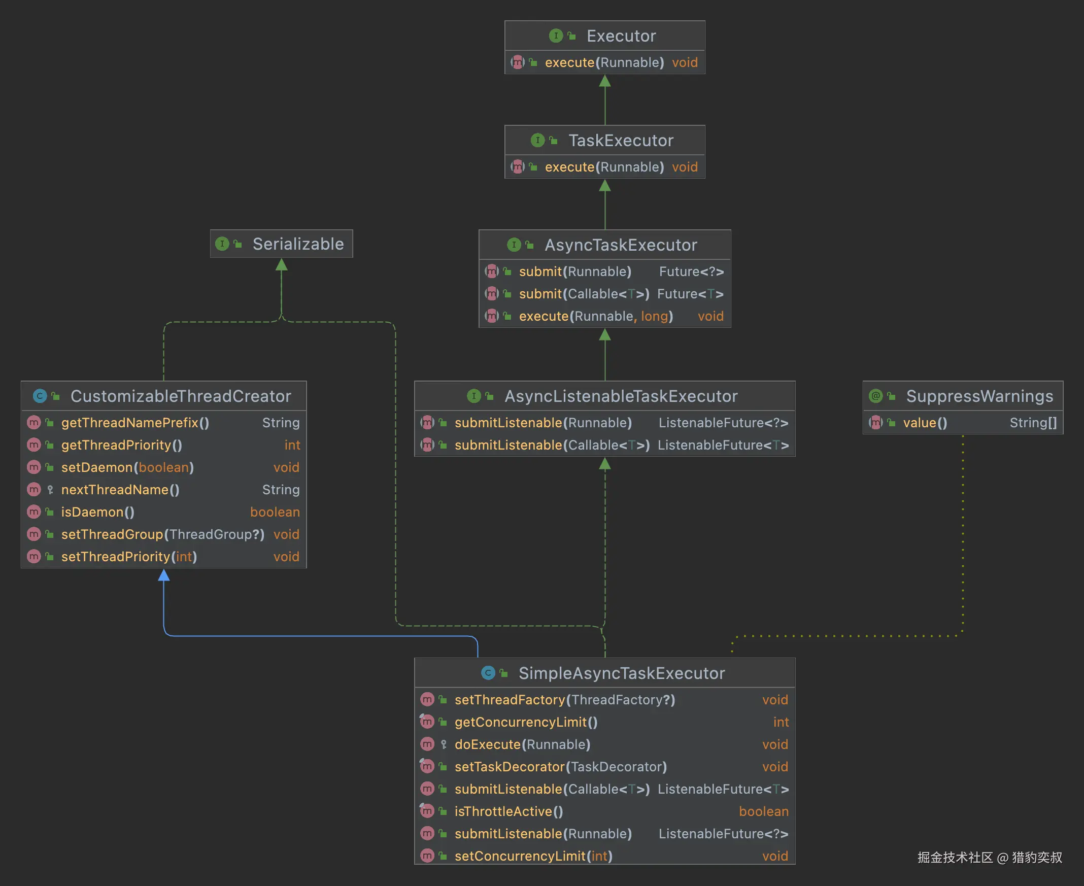 结合之前说过的MTrace线程池代理模型,我们继续再来看看SimpleAsyncTaskExecutor的类图: