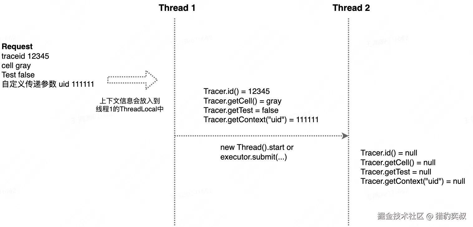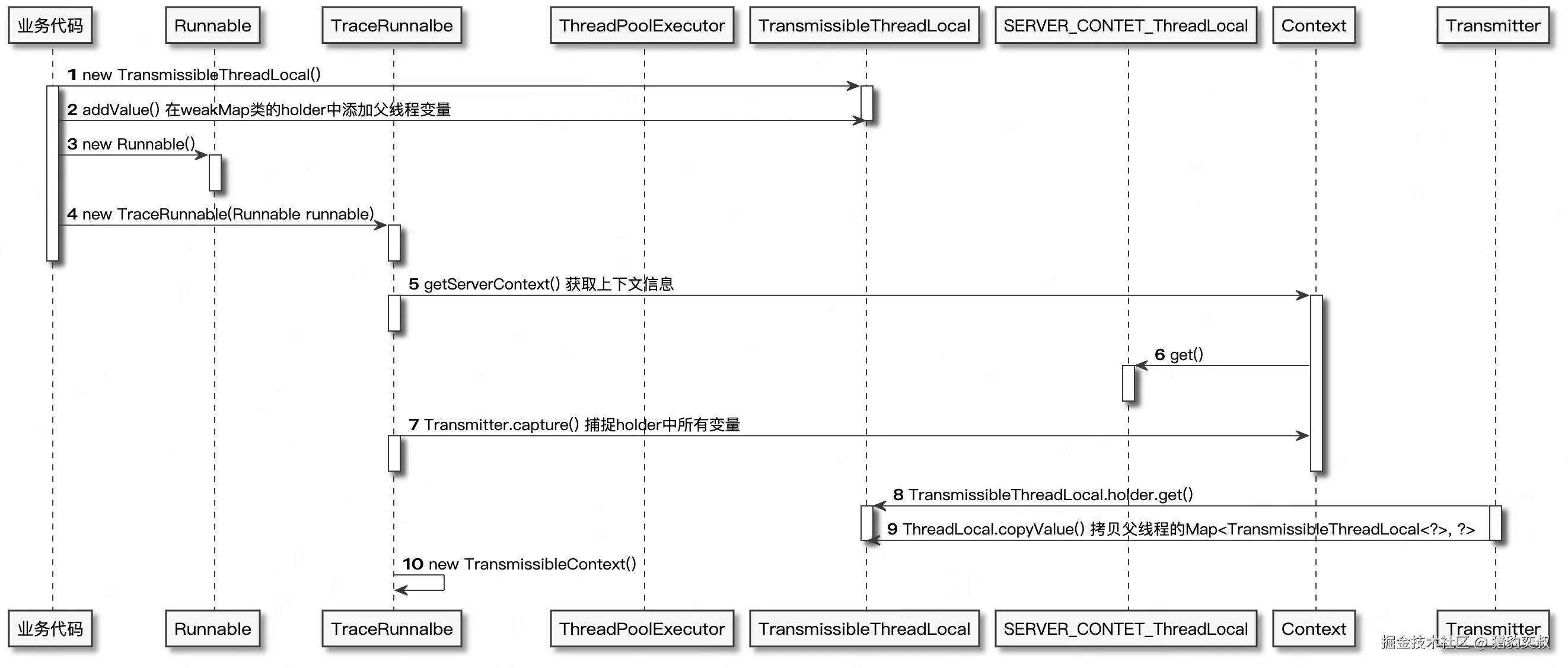 这一问题MTrace其实已经提供解决方案,主要的设计思路是在子线程初始化Runnable对象的时候首先会去父线程的ThreadLocal中拿到保存的trace信息,然后作为参数传递给子线程,子线程在初始化的时候设置trace信息来避免丢失。下面我们看看具体实现。