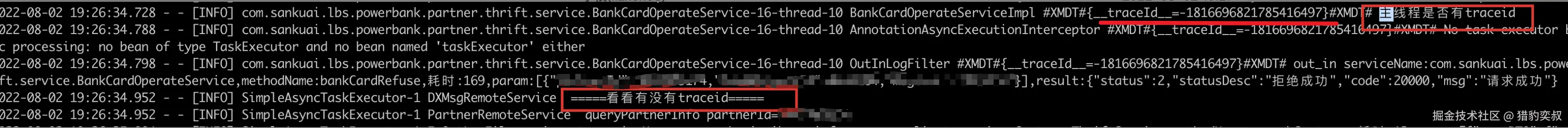 在机器中可以清楚的发现“2022-08-02 19:26:34.952 DXMsgRemoteService ”这一行日志信息并没有携带TraceId,导致调用链路信息戛然而止,无法追踪当时的调用情况。