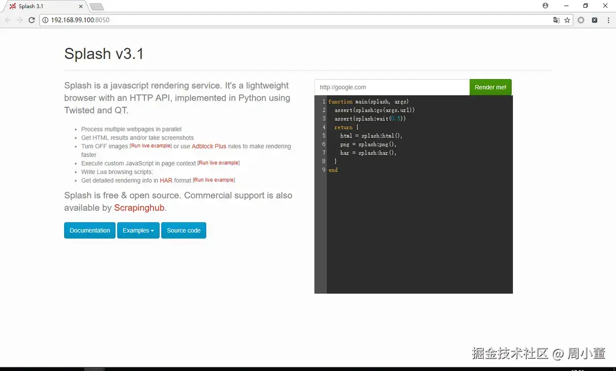 我们在8050端口上运行了Splash服务,打开http://192.168.99.100:8050/即可看到其Web页面