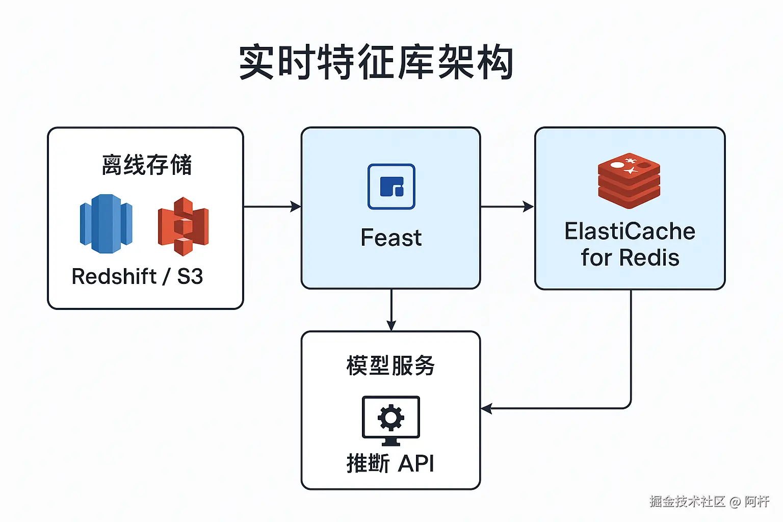 业界的套路其实挺清晰了:离线特征放在大数据存储(S3 / Redshift / Hudi / Iceberg),训练时取历史;线上特征必须放在一个超快的内存数据库里。