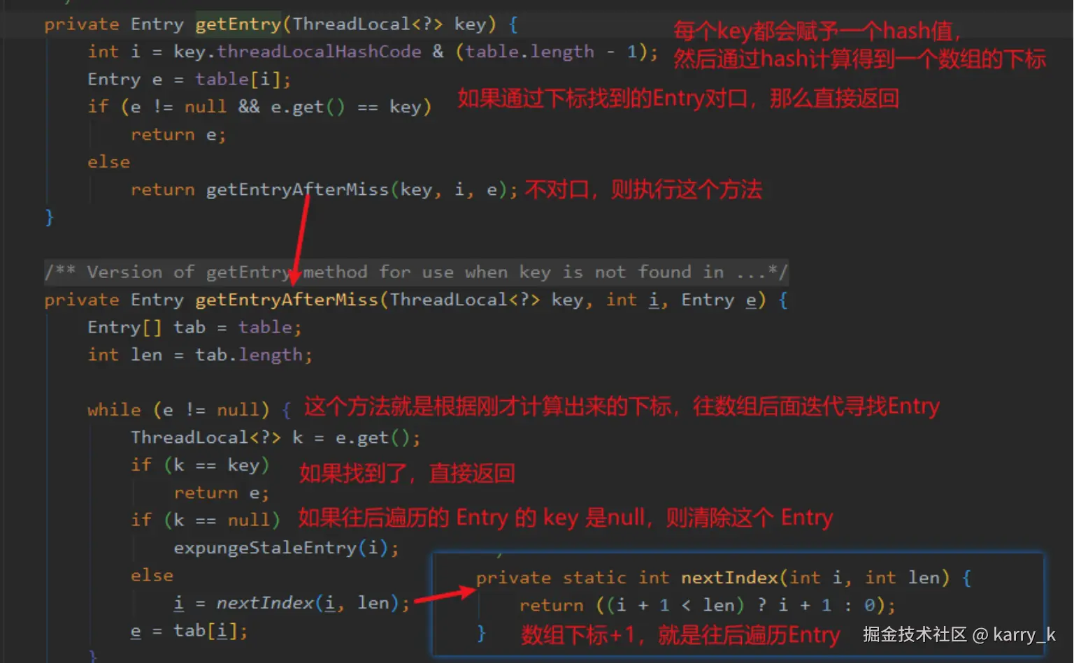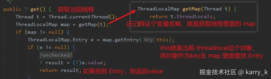 从这可以看出为什么不同的线程对同一个ThreadLocal对象调用get方法能得到不同的值。