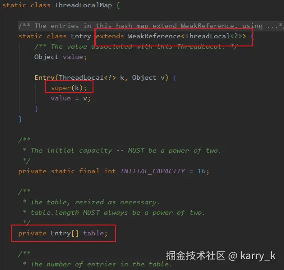 里边有一个Entity数组,继承了WeakReference即弱引用。但是这个不是说是数组弱引用,而是Entry里边的super(k),这个key才是弱引用。