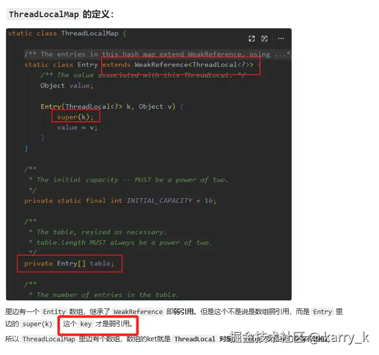 ThreadLocalMap 是 ThreadLocal 的静态内部类,是为了表达逻辑归属关系,但又不让 Map 对 ThreadLocal 实例形成强引用,从而避免内存泄漏。