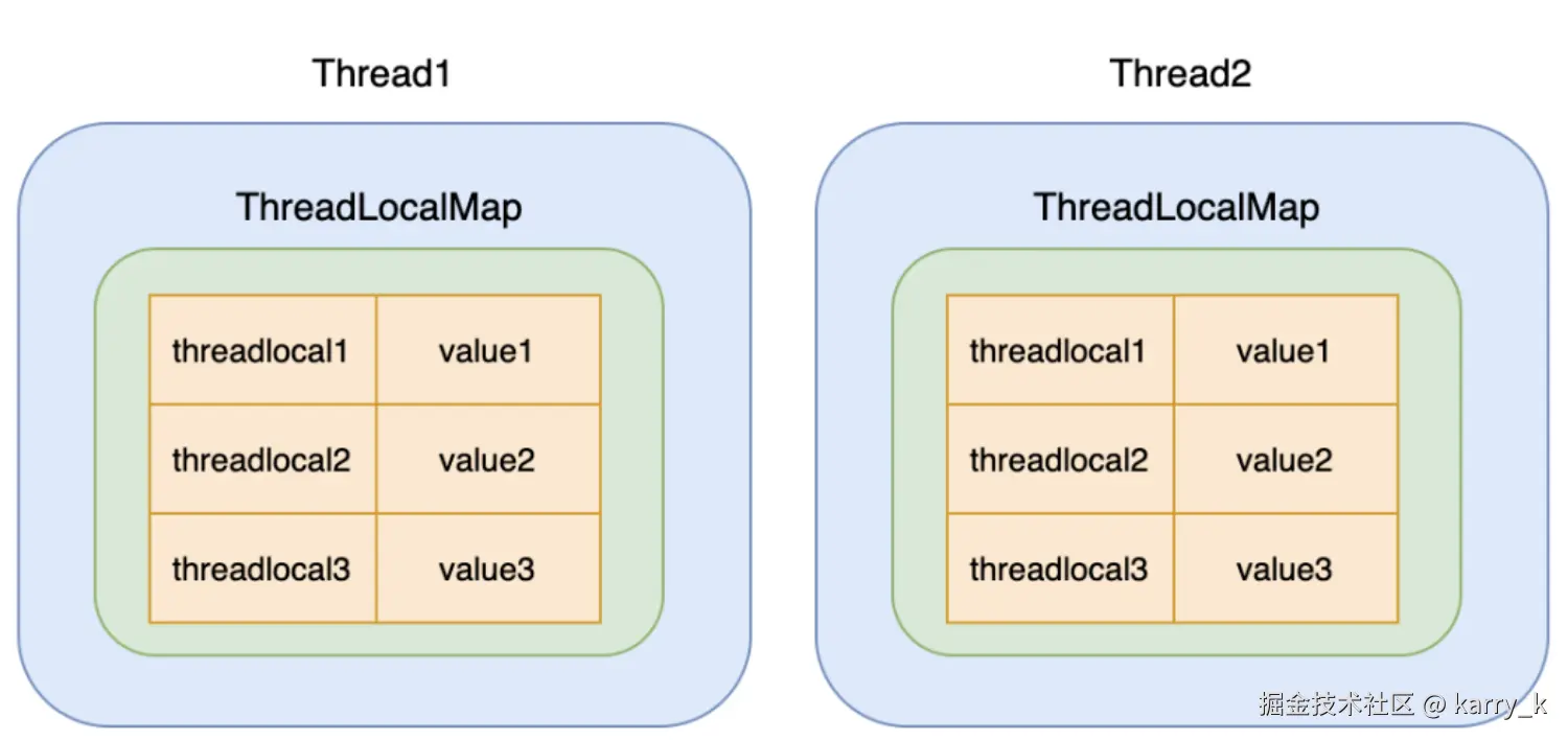 ThreadLocal提供了一种线程内独享的变量机制,使每个线程都能有自己独立的变量副本。每个线程内部维护一个ThreadLocalMap!!!这个ThreadLocalMap用于存储线程独立的变量副本。ThreadLocalMap以ThreadLocal实例作为key,以线程独立的变量副本作为值。不同的线程通过ThreadLocal获取各自的变量副本,而不会影响其他线程的数据。