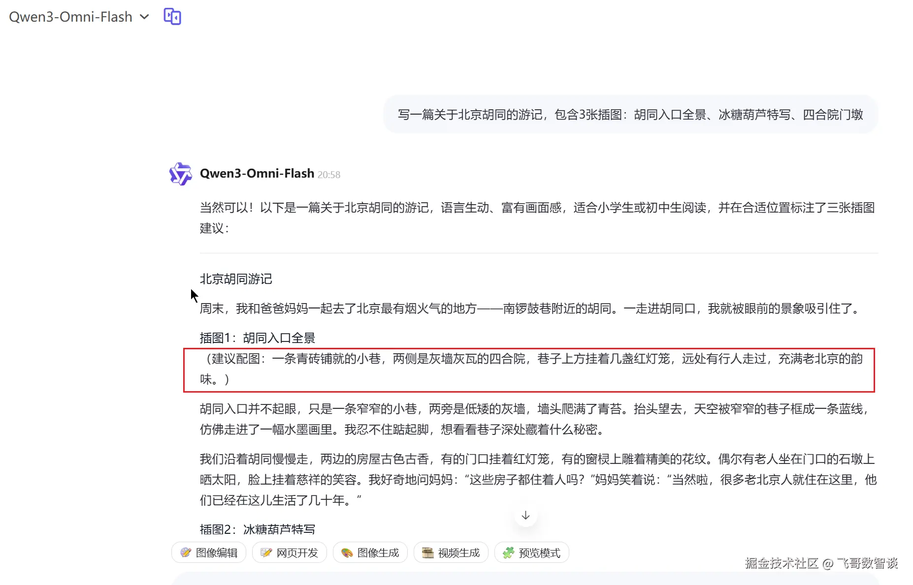 相比之下,Qwen3-Omni 目前尚未开放图文混合生成能力,更多聚焦于“多模态输入 + 文本/语音输出”的流式交互场景。