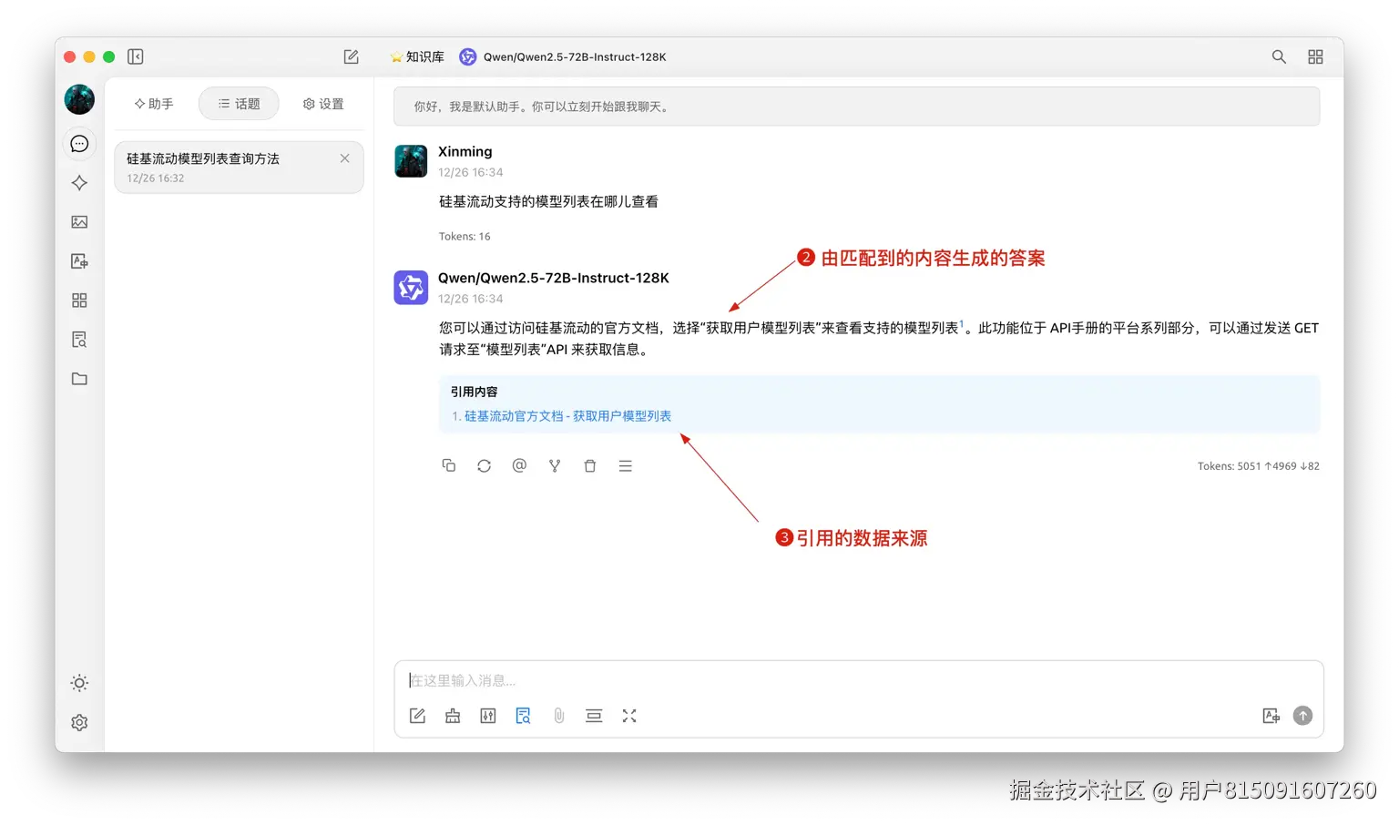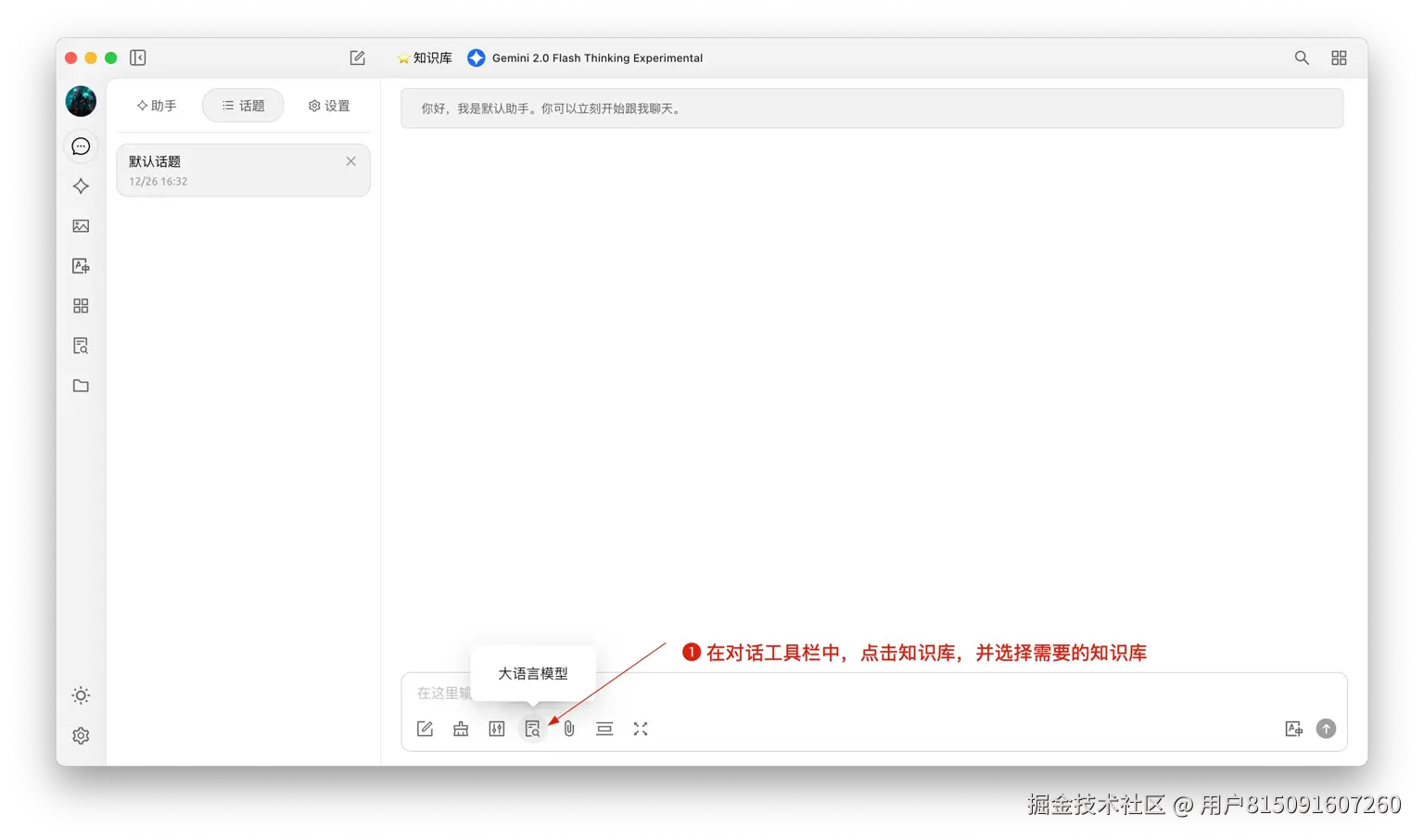 - 创建一个新的话题,在对话工具栏中,点击知识库,会展开已经创建的知识库列表,选择需要引用的知识库;