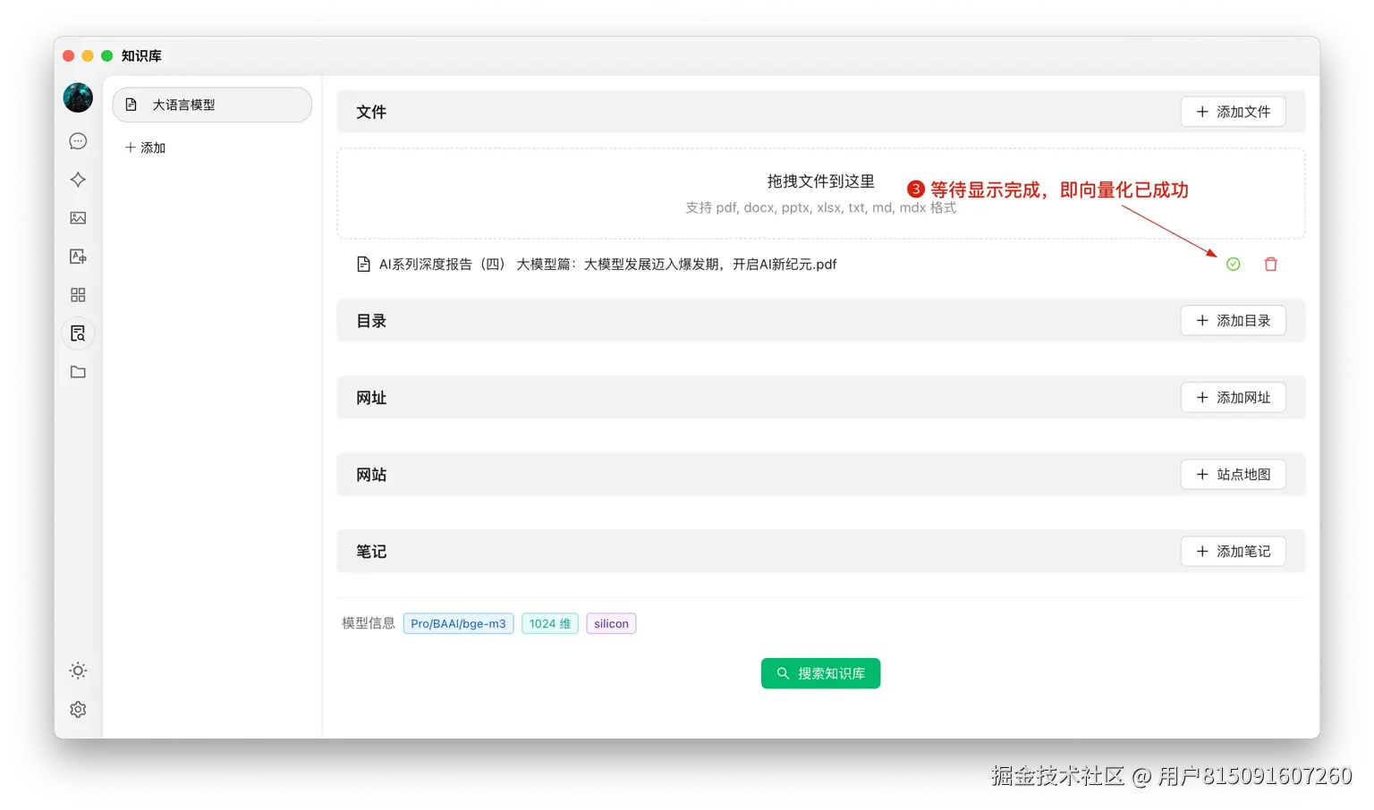 - 向量化:系统会自动进行向量化处理,当显示完成时(绿色 ✓),代表向量化已完成。
