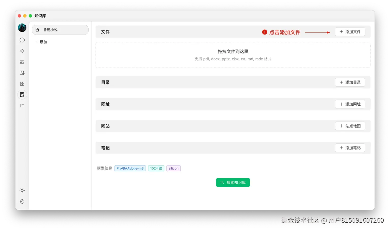 - 知识库入口:在 CherryStudio 左侧工具栏,点击知识库图标,即可进入管理页面;