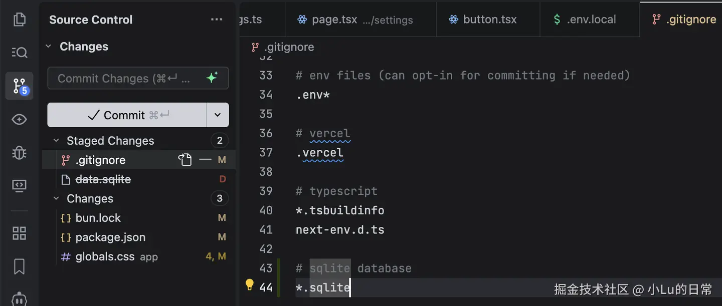 之后 .gitignore 的 data.sqlite 规则就会生效,新变更不会再出现在“Changes”。