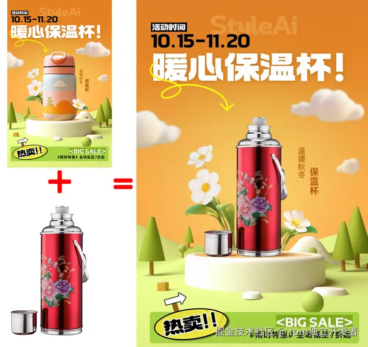 提示词:将图一的保温瓶更换成图二的保温壶,保持图一的风格
