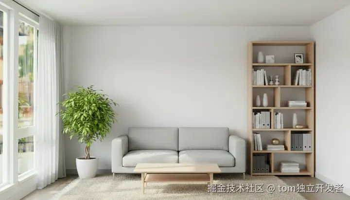 提示词:在靠墙角落加一株绿色植物盆栽,在右侧放一个大书架