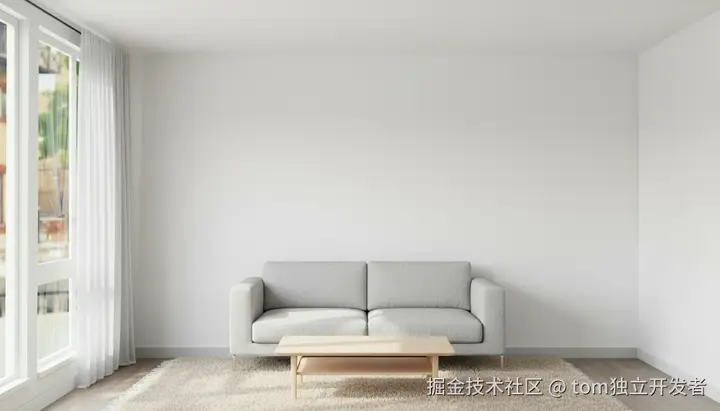 提示词:在房间地面中央铺一块大面积米色地毯,并为落地窗增加一层浅灰色纱帘;在地毯上摆放一张现代风格的浅灰色双人沙发和一个原木色小茶几