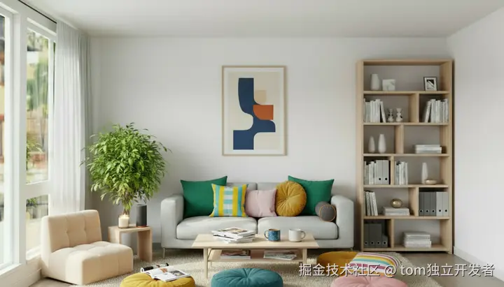 提示词:在沙发对面靠窗角落放一张小巧懒人沙发或单人休闲椅,适合阅读和休憩,墙角放置一台音响或蓝牙音箱,地毯一侧增加几个不同颜色的圆形坐垫;地上可摆设几本杂志或一个香薰蜡烛