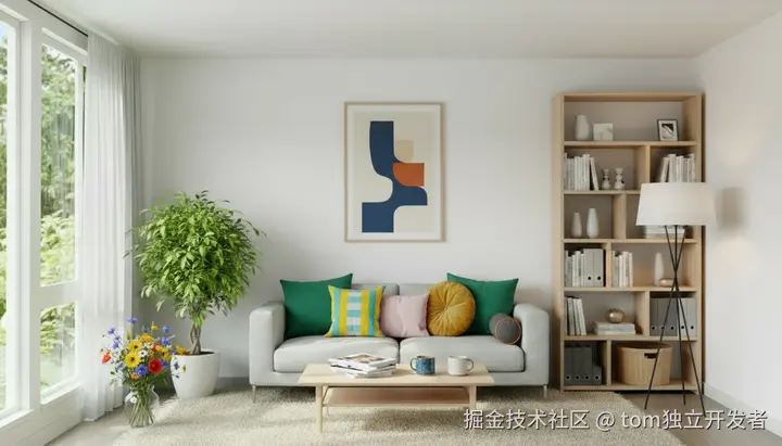 提示词:在沙发背景墙上挂一幅极简抽象画作,沙发上摆放几只彩色抱枕,茶几上放杂志和陶瓷马克杯