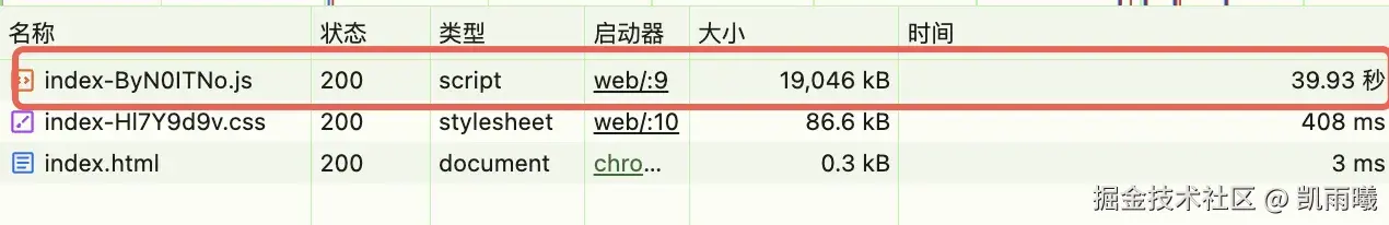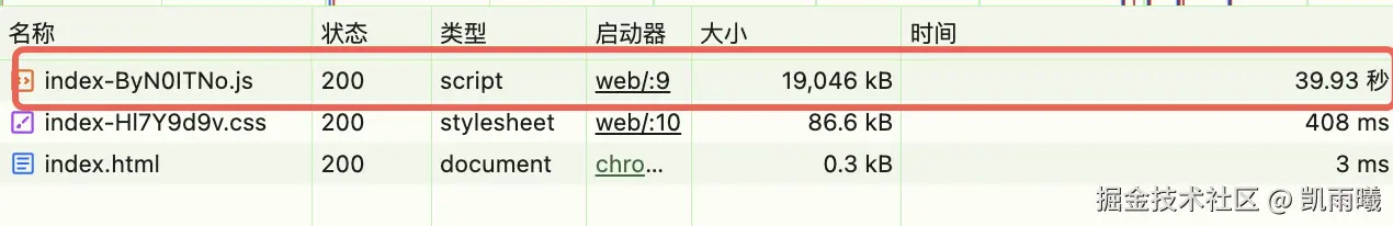 发现:如下方示意图所示,生产环境的所有前端代码(包括第三方库和业务代码)都被打包成了一个巨大的 JavaScript 文件(单一 Chunk)。该资源文件的下载时间就接近 40 秒。