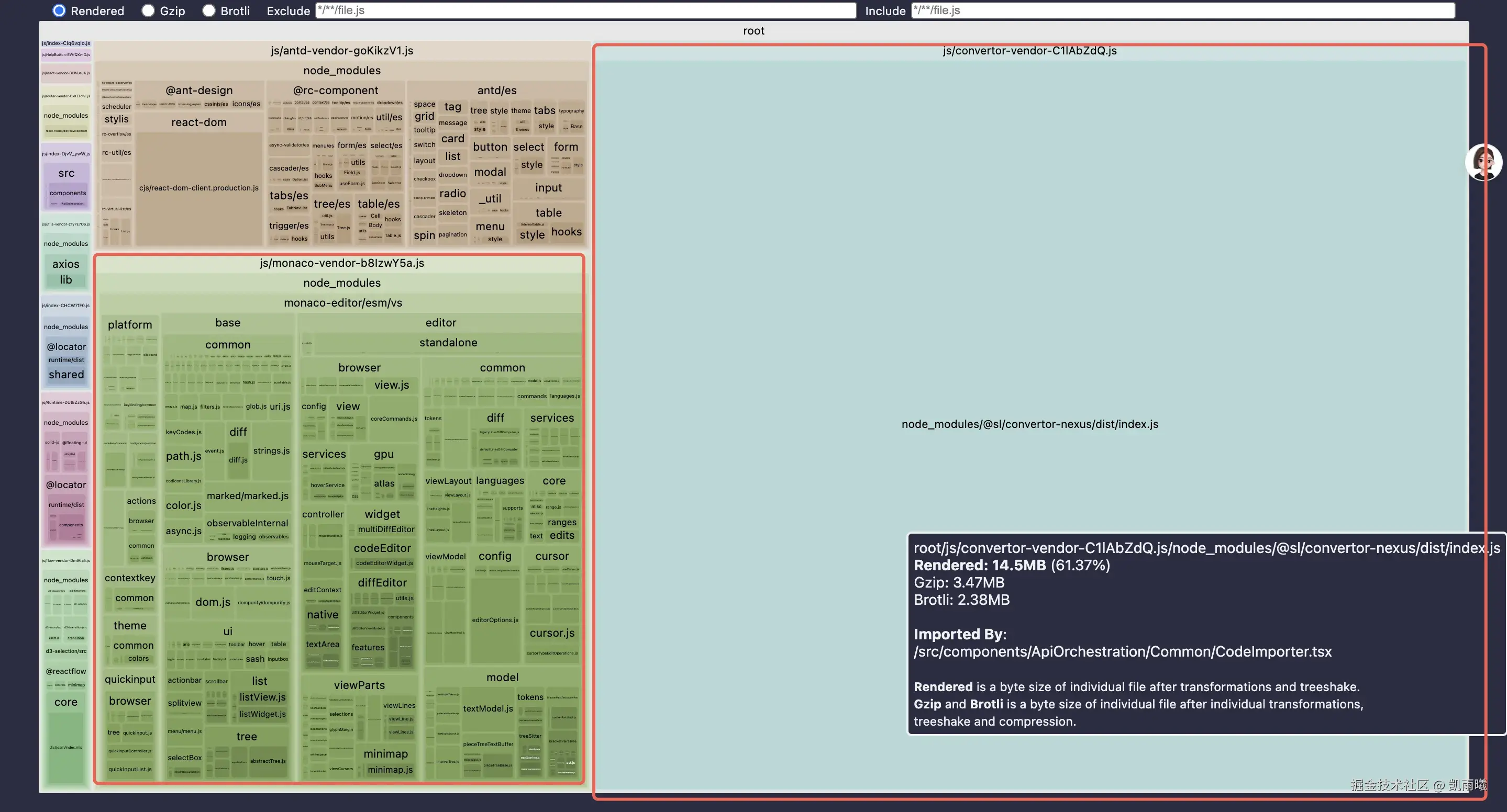 通过 Vite 的可视化分析工具发现,新版本中增加的 @sl/convertor-nexus、react-monaco-editor和 monaco-editor等依赖包占据了绝大部分打包体积,这些包是为"TS/Go Struct"导入和可视化编辑器功能引入的。这正是新版本首屏白屏问题暴露的主要原因。