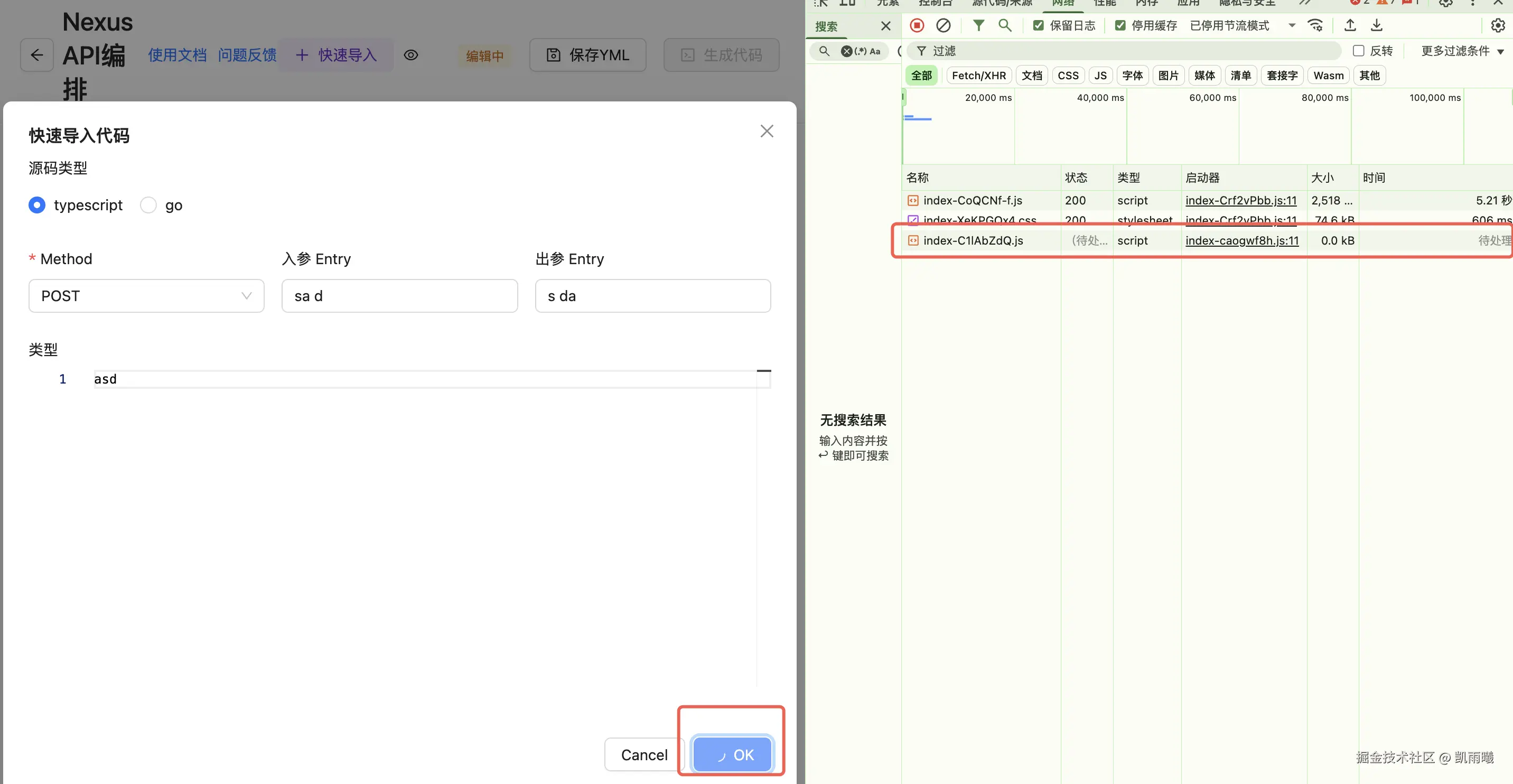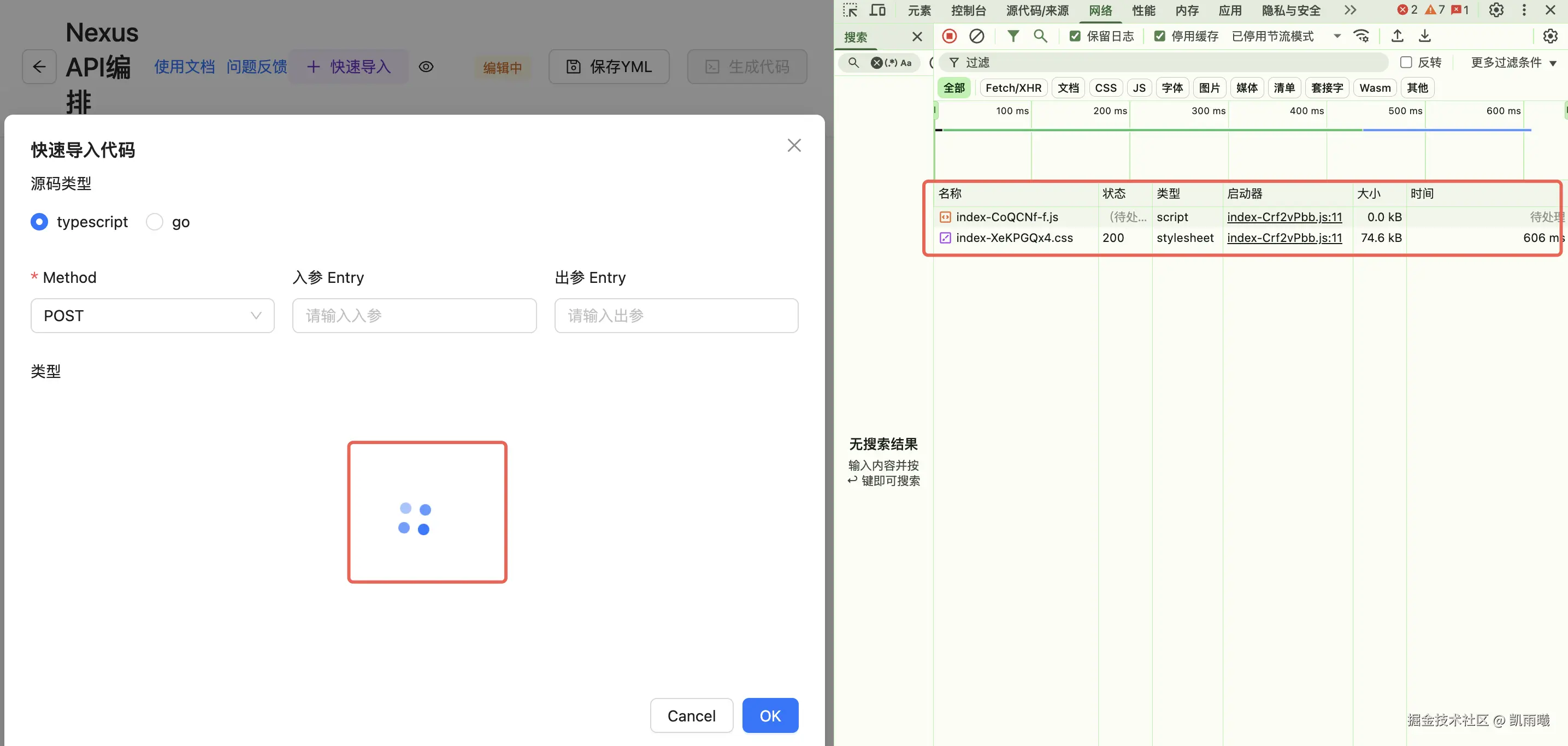 | CSS | 两个CSS文件 | 三个CSS文件 | 通过对编辑器功能实施懒加载策略,仅在用户点击"TS导入"按钮时加载相关资源。使得原本 86.11KB 的CSS文件被拆分为: + 11.93KB 的核心CSS(包含React Flow样式,为ApiOrchestration页面必需加载) + 74.19KB 的monaco-editor相关CSS(延迟到点击按钮后加载) |