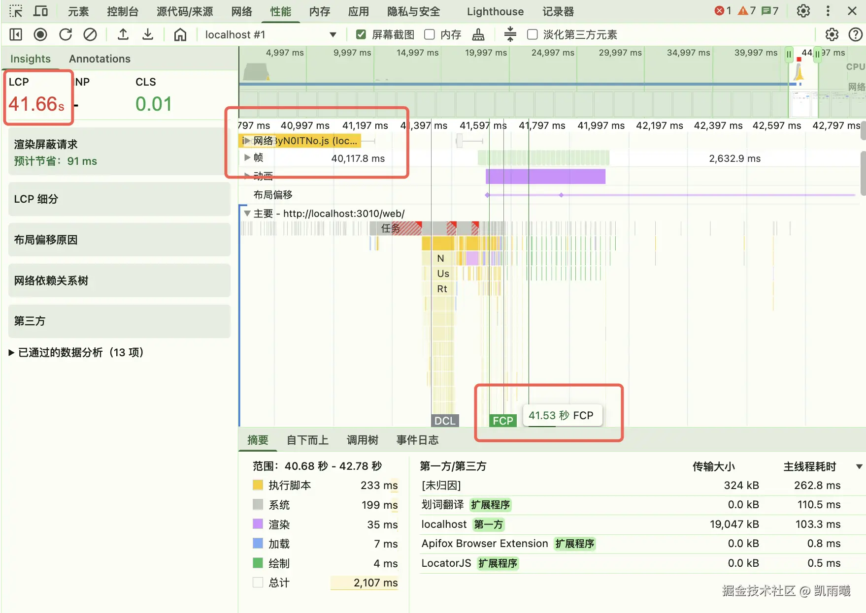 - FCP(首次内容绘制):衡量浏览器首次绘制出任何来自 DOM 的内容(如文本、图片等)的时间点。它是“白屏阶段结束”的标志。本次高达 41.53 秒的 FCP,意味着用户等待了超过 40 秒才看到页面脱离完全空白的状态。