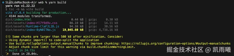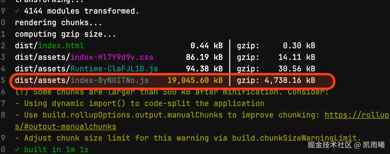在构建分析中发现,这个94.38KB的Runtime chunk属于纯开发依赖,当前错误地被打包进生产环境,不仅增加了不必要的资源体积,还可能带来安全隐患。通过将静态导入改为条件动态导入,我们实现了环境隔离:静态导入在模块解析阶段就被处理,无论后续是否使用都会被打包;而动态导入是运行时执行,只有在开发环境条件满足时才会加载模块,生产环境下该模块会被Tree Shaking完全移除。