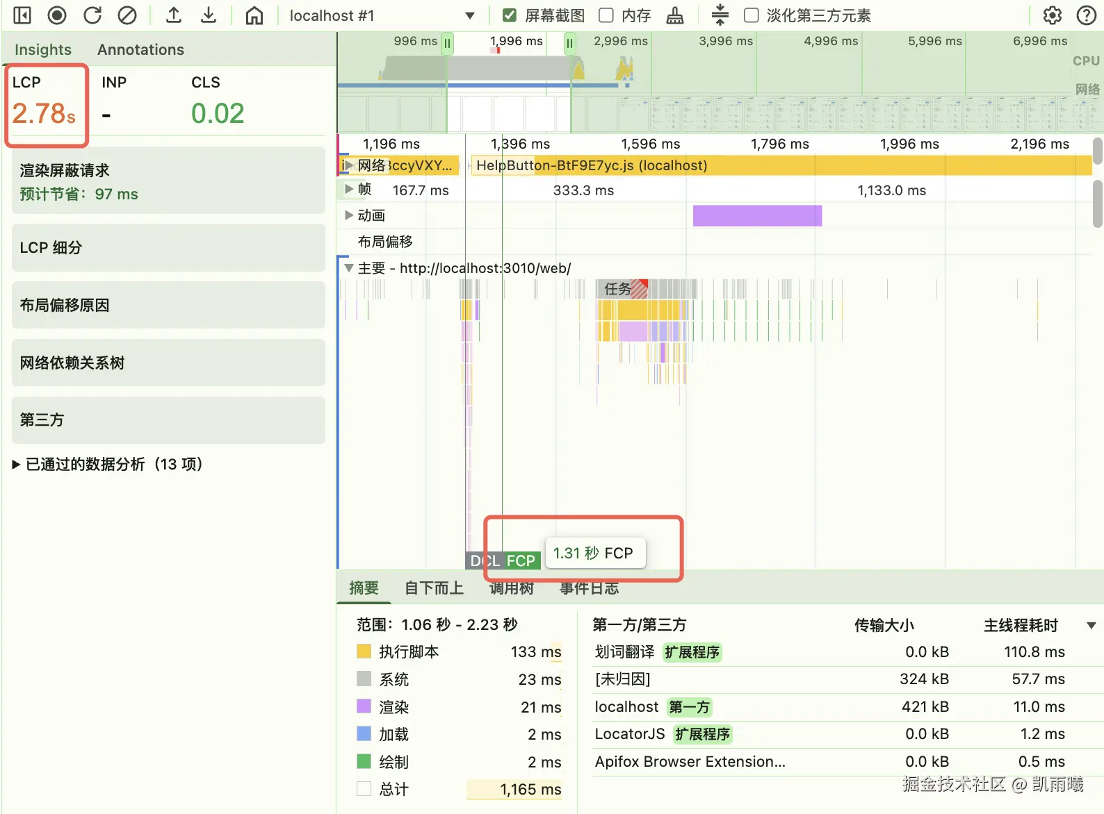 通过 Chrome DevTools 的 Performance 面板录制并分析页面加载过程,我们获取了以下关键性能指标:
