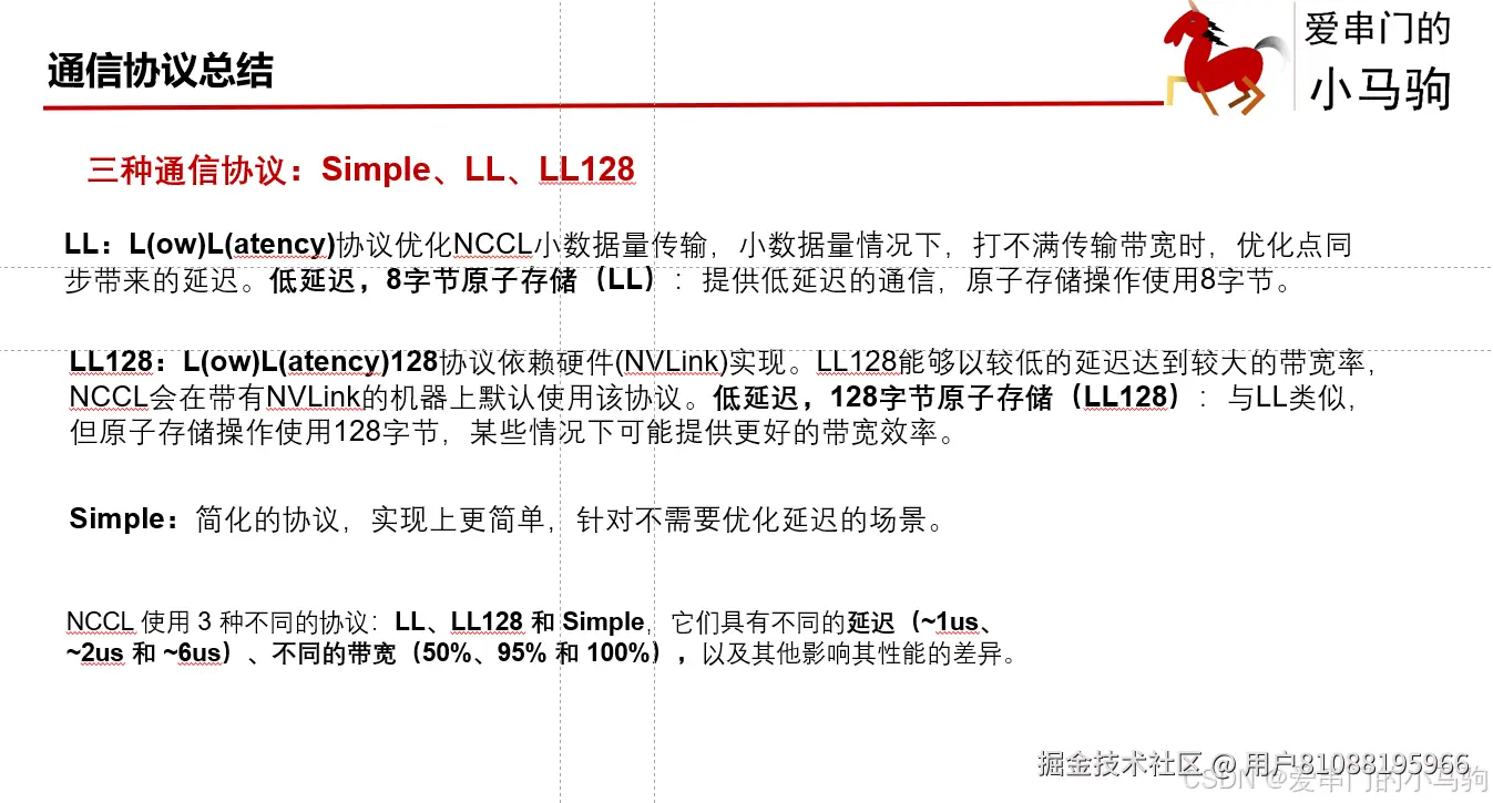 LL128:L(ow)L(atency)128协议依赖硬件(NVLink)实现。LL128能够以较低的延迟达到较大的带宽率,NCCL会在带有NVLink的机器上默认使用该协议。低延迟,128字节原子存储(LL128):与LL类似,但原子存储操作使用128字节,某些情况下可能提供更好的带宽效率。