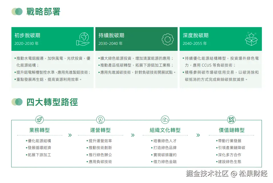 在这条赛道上,中国宏桥同样是率先起跑的“模范生”。其发布的《中国宏桥集团有限公司碳减排行动报告》中,详细规划了“初步脱碳、持续脱碳、深度脱碳”的“三步走”策略。