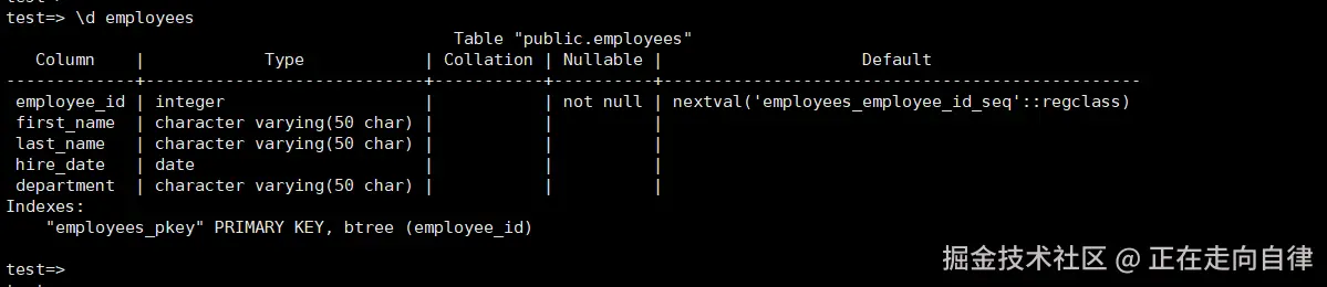 上述输出详细展示了employees表的各个字段信息,包括字段名、数据类型、是否可空以及默认值等 。同时,还显示了表的主键索引信息,进一步验证了表的创建符合预期设计 。