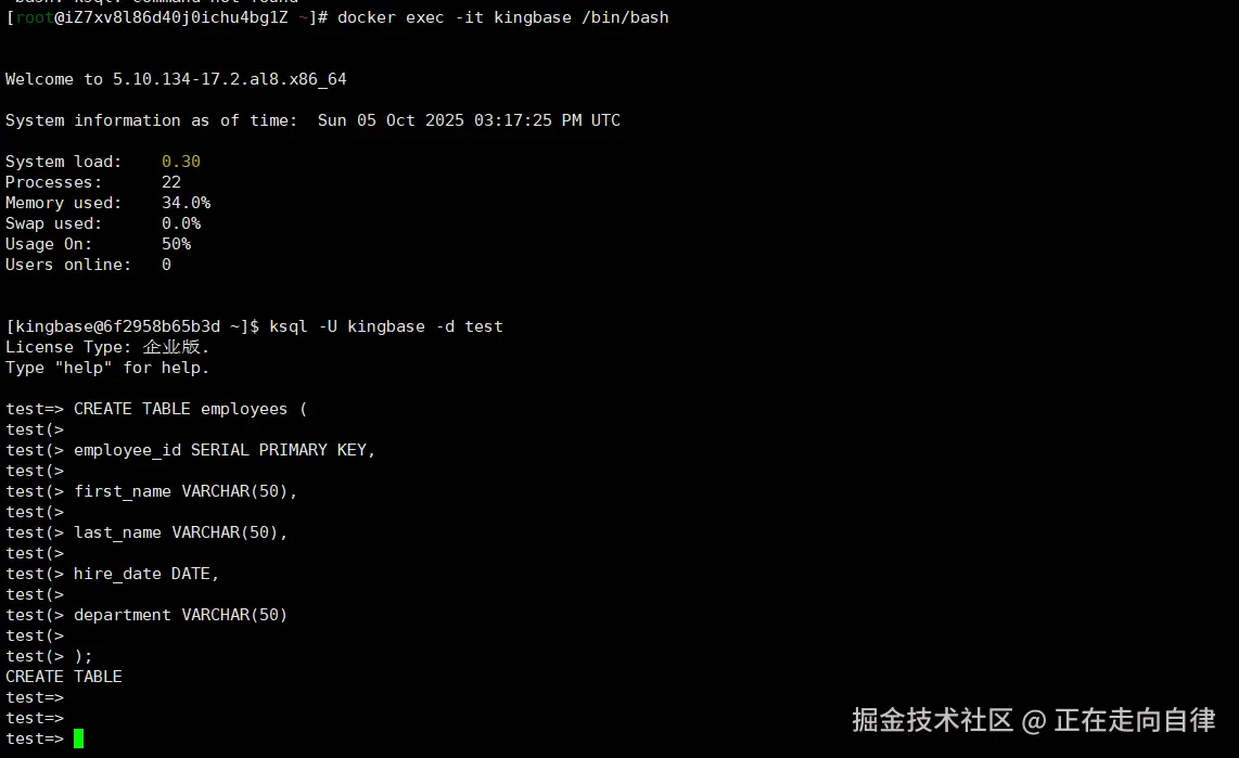 使用ksql命令行工具连接到 KingbaseES 数据库 。执行以下创建表的 SQL 语句: