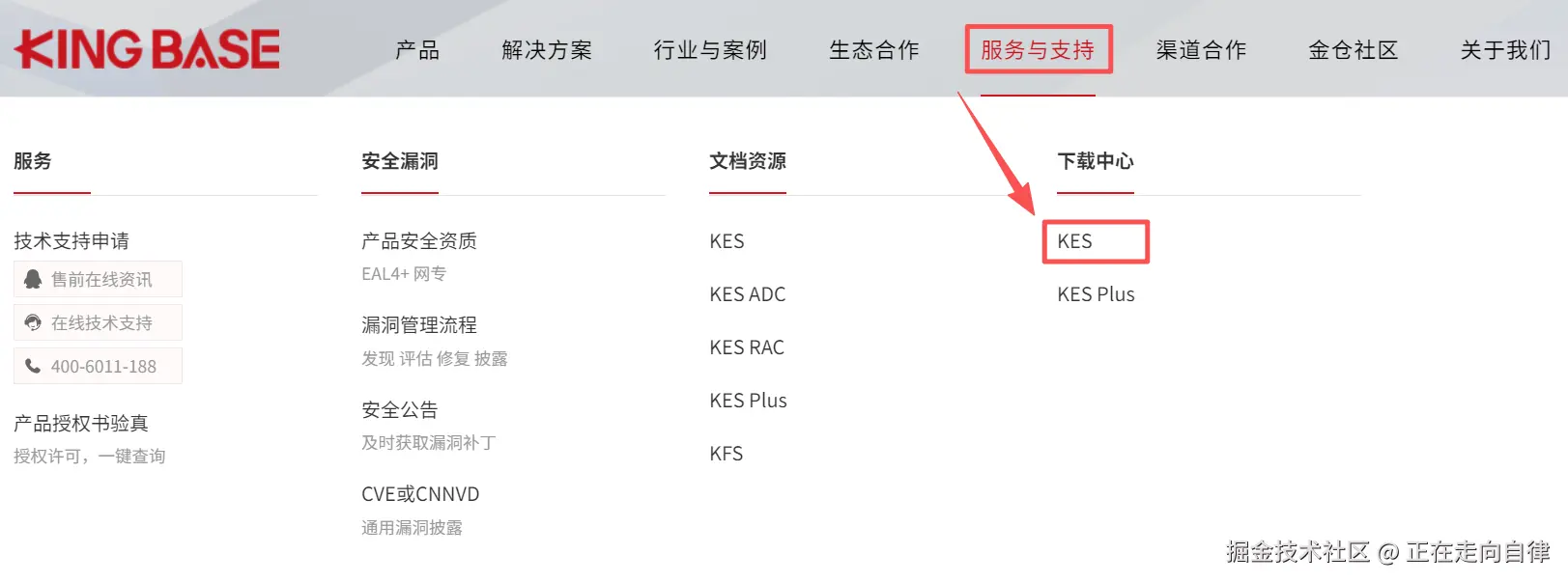 2、入口位置:服务与支持 > 下载中 > KES,如下图所示: