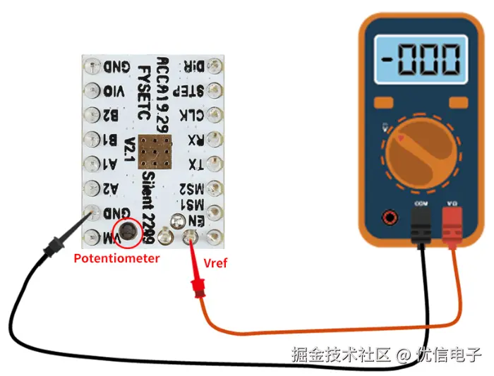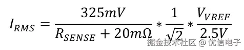 其中,TMC2209的Rsense检测电阻为0.11欧姆,把测量到的Vref和Rse检测电阻代入上述公式即可计算出相应的Irms驱动电流。