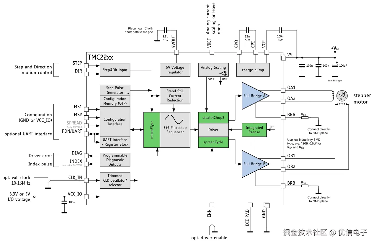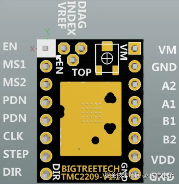 该TMC2208只需要在其微型封装上安装几个控制引脚。它们允许选择最重要的设置:所需的微步长分辨率。可选择 2、4、8、16 或 32 微步,使驱动器适应运动控制器的功能。 一些封装选项还允许通过引脚选择斩波器模式。该TMC2209只需要在其微型封装上安装几个控制引脚。它允许选择最重要的设置:所需的微步长分辨率。可选择 8、16、32 或 64 微步,或从全步到 1/256 步,使驱动器适应运动控制器的功能。