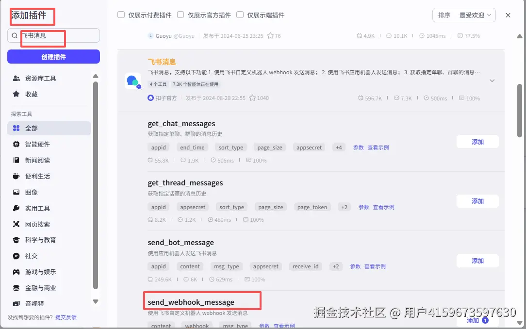 - 添加节点,选择"插件",键入"飞书消息",添加sendwebhookmessage